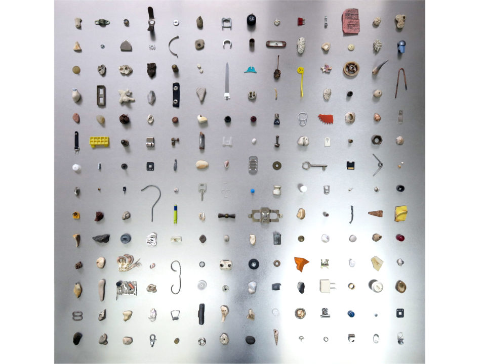 Sous l’apparence d’une collecte d’éléments homogènes et naturels – quelques cailloux et coquillages – des intrus viennent se greffer au fur et à mesure que l’on observe cette collection. Ces derniers prennent le plus souvent la forme de déchets, à travers des fragments d’objets perdus, des résidus. Ce passage d’un ensemble homogène à un ensemble hétérogène révèle les failles de notre propre perception. Ce leurre, à travers cet “inframince” qui s’éveille au grand jour, questionne notre rapport à notre environnement et à la banalisation de la pollution. Cet effet miroir nous montre comment la pollution s’immisce de manière insidieuse dans notre environnement, sur la durée (trois décennies) et à une petite échelle (moins d’un mètre carré). Bien que contradictoire, il révèle comment de petits restes hétéroclites, une fois accumulés, forment un tout et constituent une archéologie contemporaine.