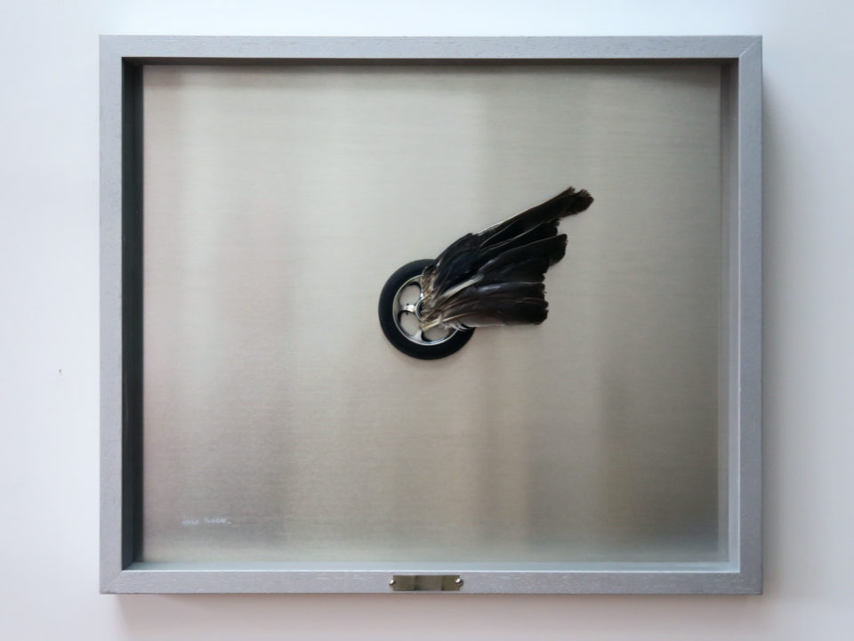 Roue de trottinette, aile de pigeon. Plaque d’aluminium gravée. Cadre sous verre anti-reflet.