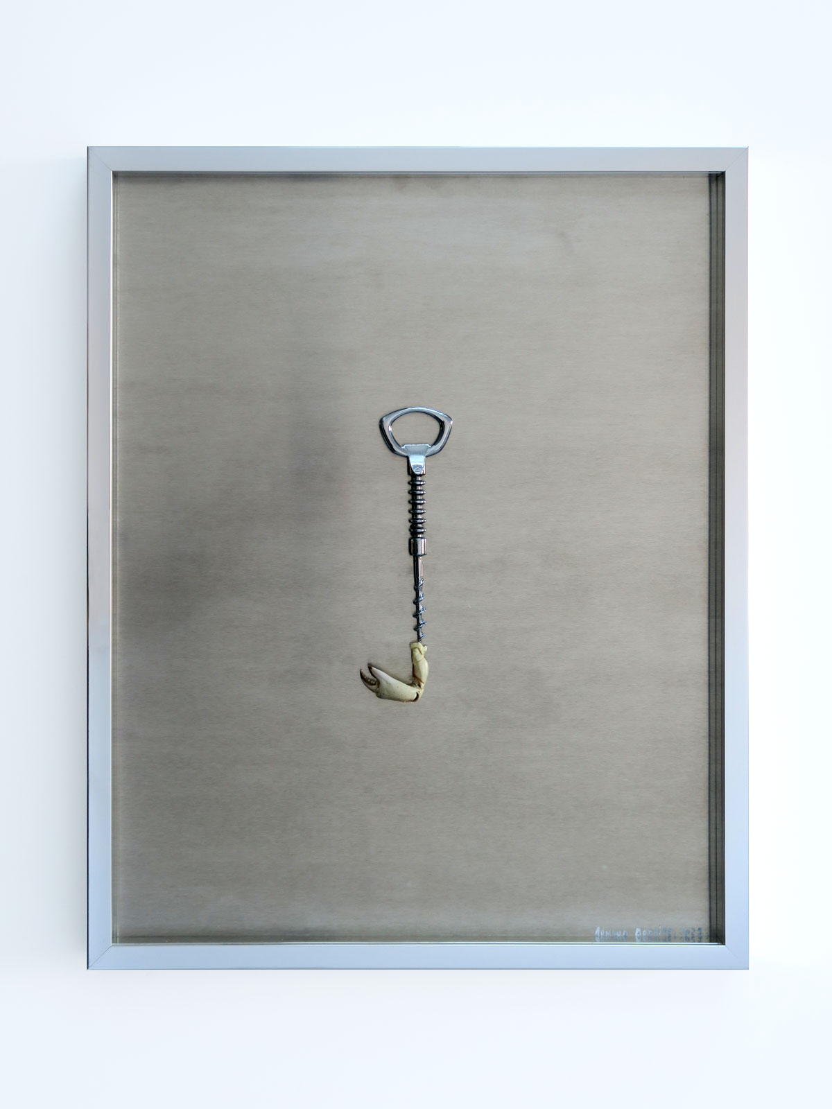 Tire-bouchon, pince de crabe. Cadre aluminium et sous verre anti-refflet.