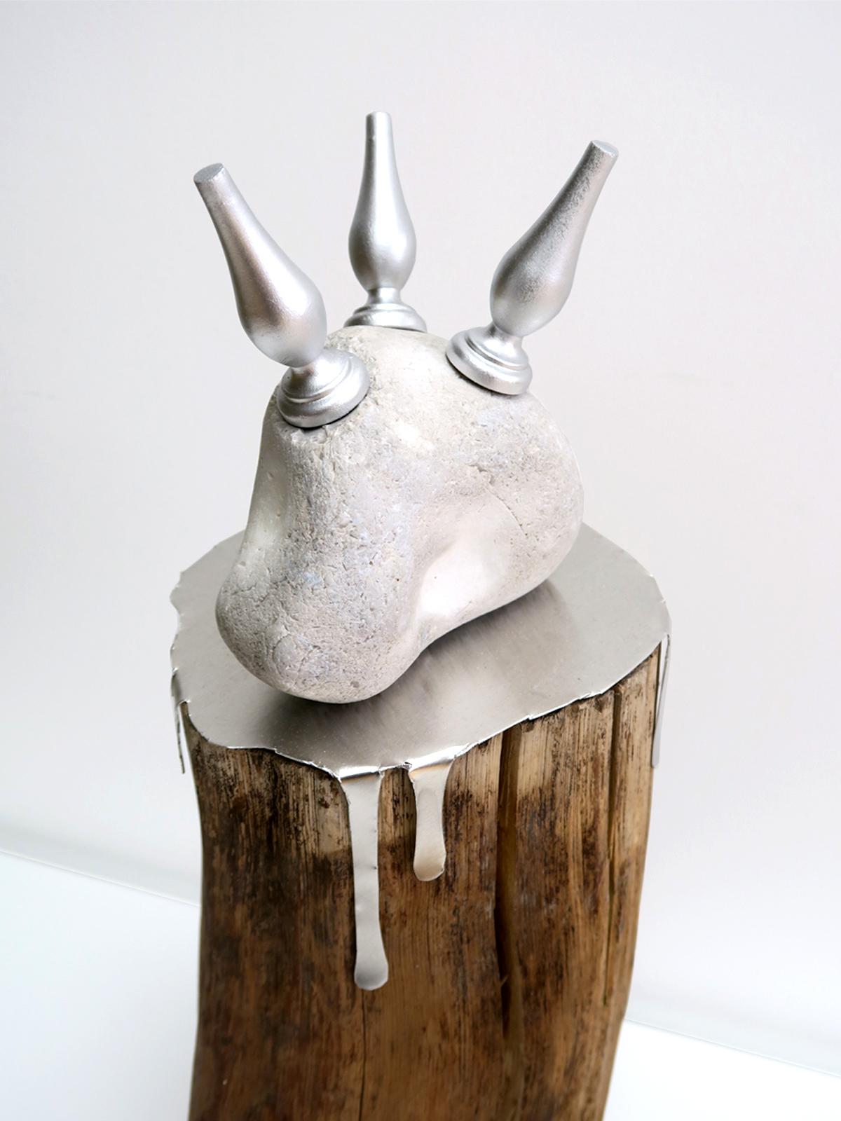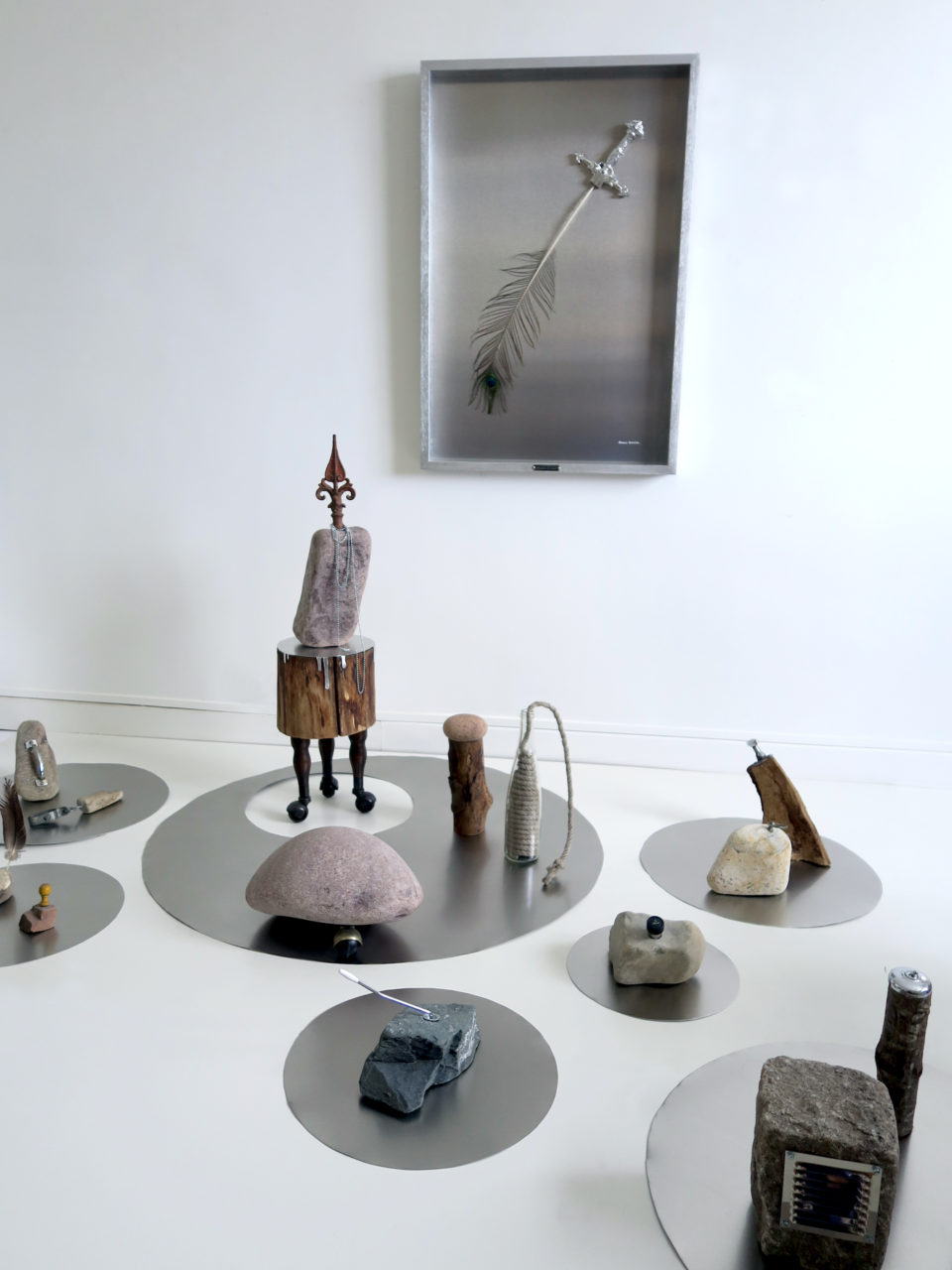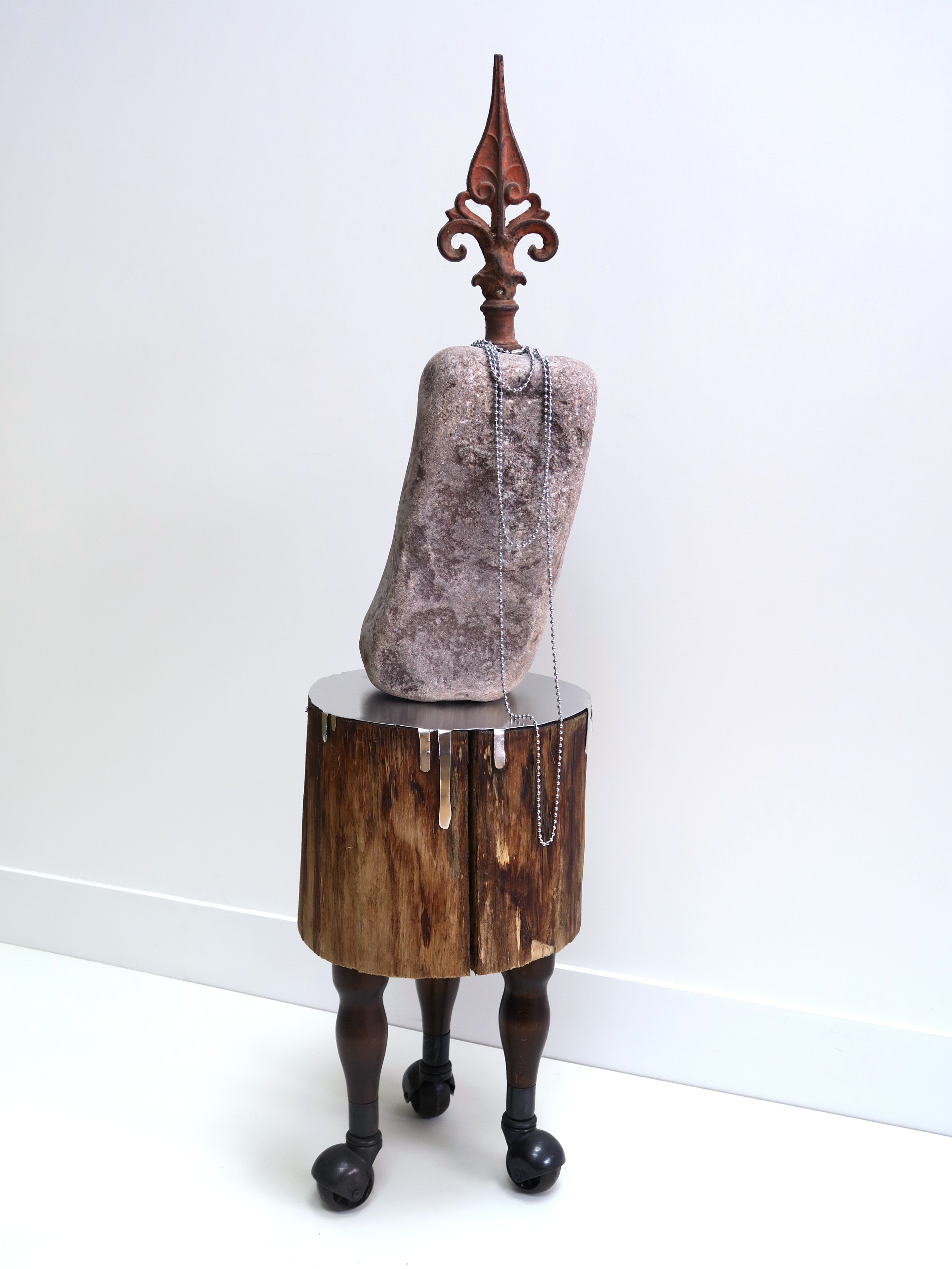 À travers cette sculpture sous forme de petite table de nuit, je cherche à brouiller les pistes et tente de rendre poreuse la frontière entre l’intérieur et l’extérieur. En effet à travers ce titre qui évoque un lieu naturel à ciel ouvert, cet assemblage d’éléments hétérogènes se rapprocherait plutôt du mobilier appartenant à nos intérieurs, grâce à sa base proche du guéridon et de ses pieds à roulettes. Ces éléments contradictoires – la partie haute étant constituée d’un tronc en bois brut, d’un bloc en pierre et d’une flèche de portail – tentent d’abolir les limites entre notre monde domestique, façonné par la main de l’homme, et un monde naturel étranger. Ce serait ce lieu intermédiaire – un entre deux – à la fois à l’abri du monde et des intempéries, mais qui serait aussi le point de départ des tourments de la vie, là où le vent se lève.