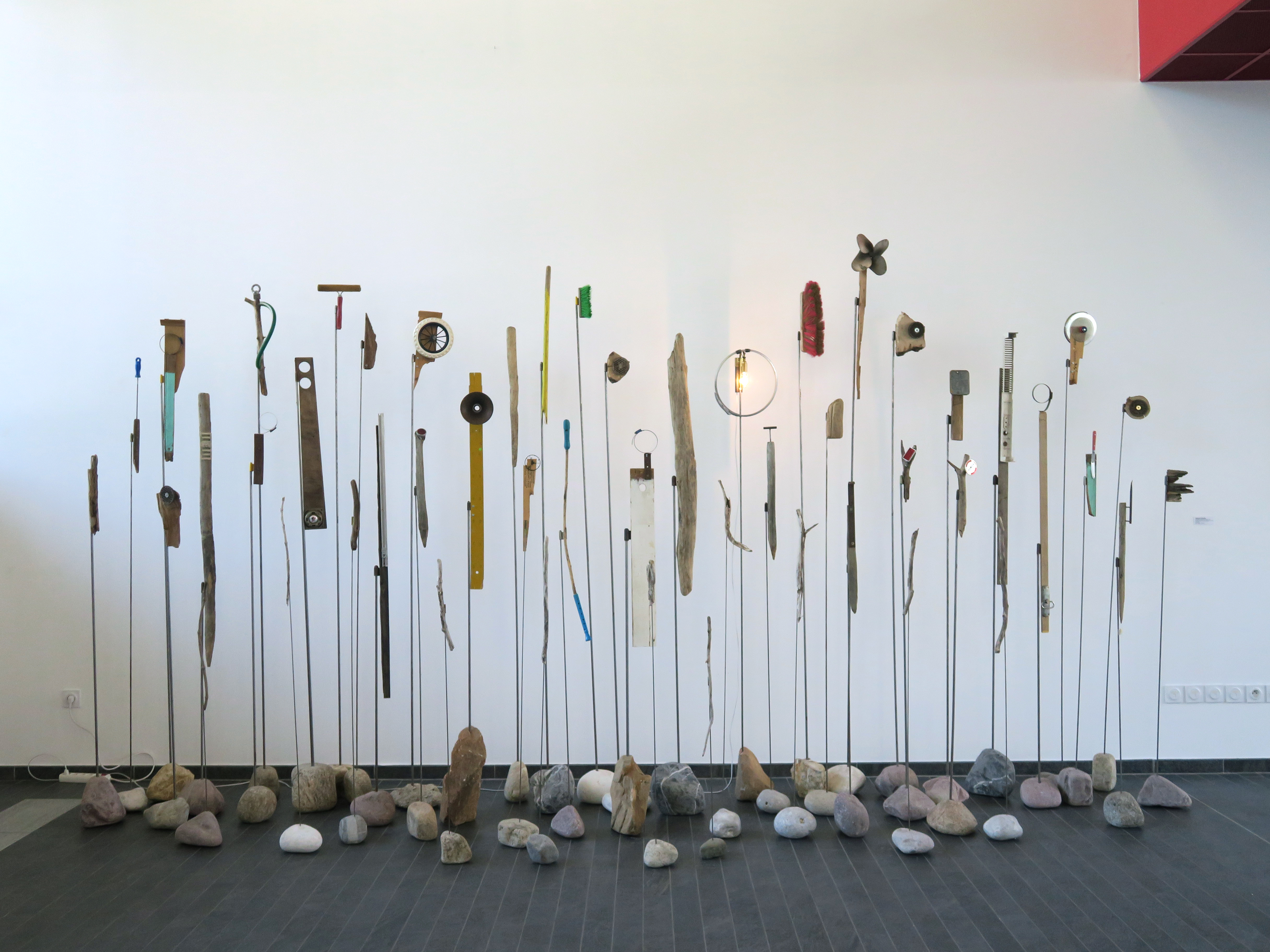 Installation de 50 assemblages sur socles en pierre réalisée entre 2015 et 2023 : bois flottés, objets de rebut, bois, métal, gonds, pierres…